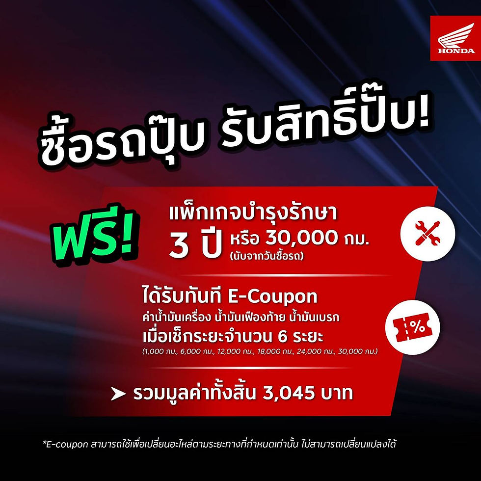 ■รับ E-Coupon รวมมูลค่า 3,045 บาท สำหรับค่าน้ำมันเครื่อง น้ำมันเฟืองท้าย และ น้ำมันเบรกเมื่อเข้ารับบริการตามระยะที่กำหนด จำนวน 6 ระยะ ได้แก่ 1,000 กิโลเมตร, 6,000 กิโลเมตร, 12,000 กิโลเมตร, 18,000 กิโลเมตร, 24,000 กิโลเมตร และ 30,000 กิโลเมตร
