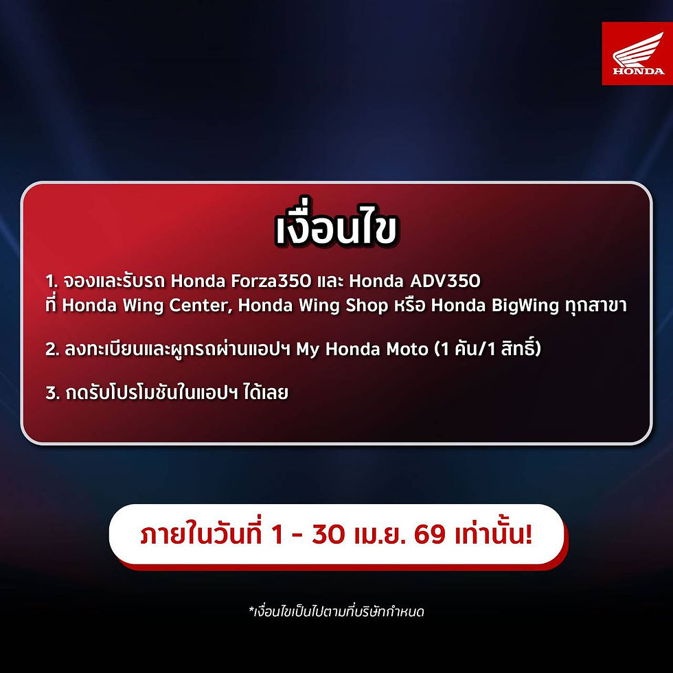 จองและรับรถ New Honda Forza350 หรือ New Honda ADV350 ที่ Honda Wing Center และ Honda BigWing ทุกสาขา ภายในวันที่ 1-30 เมษายน 2569